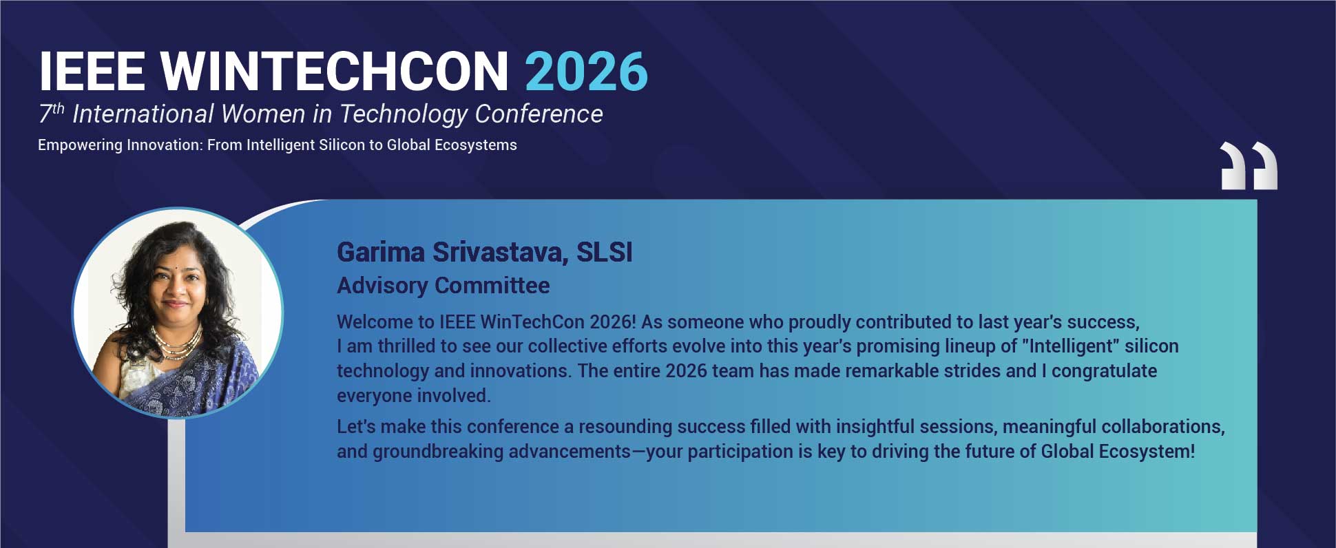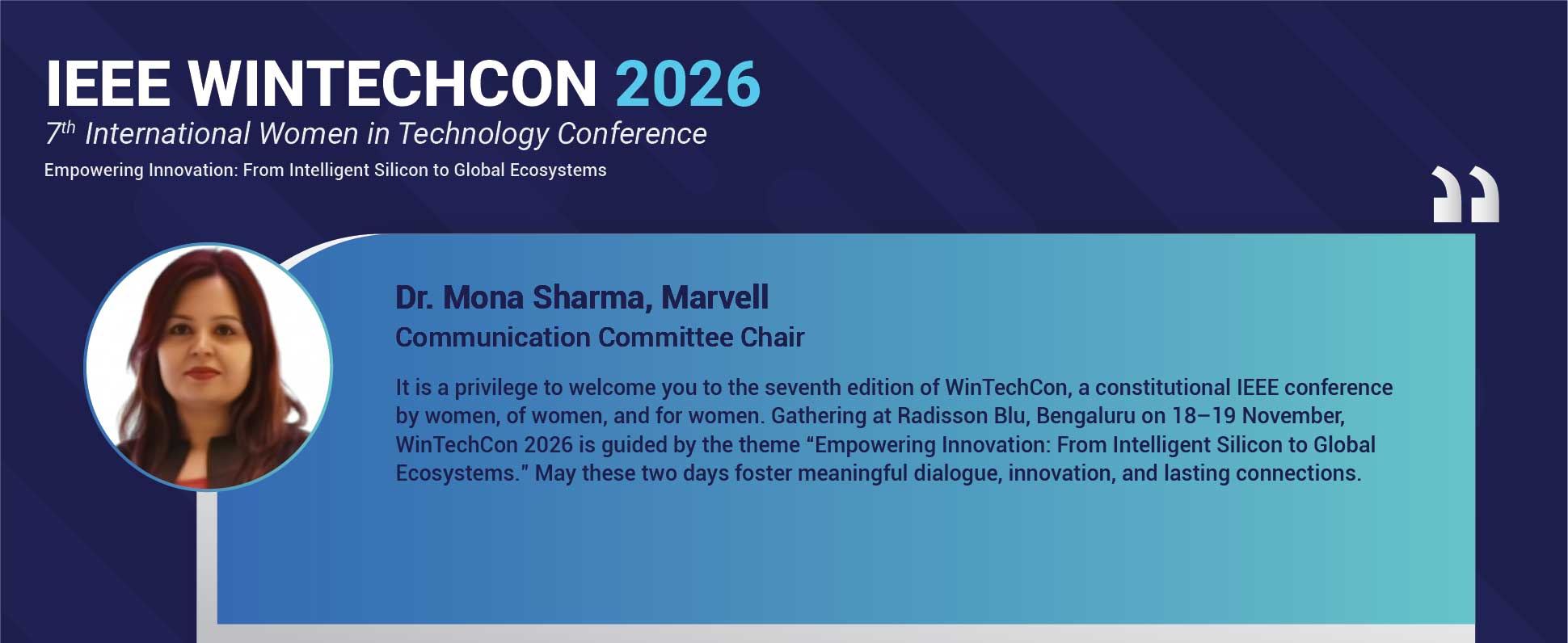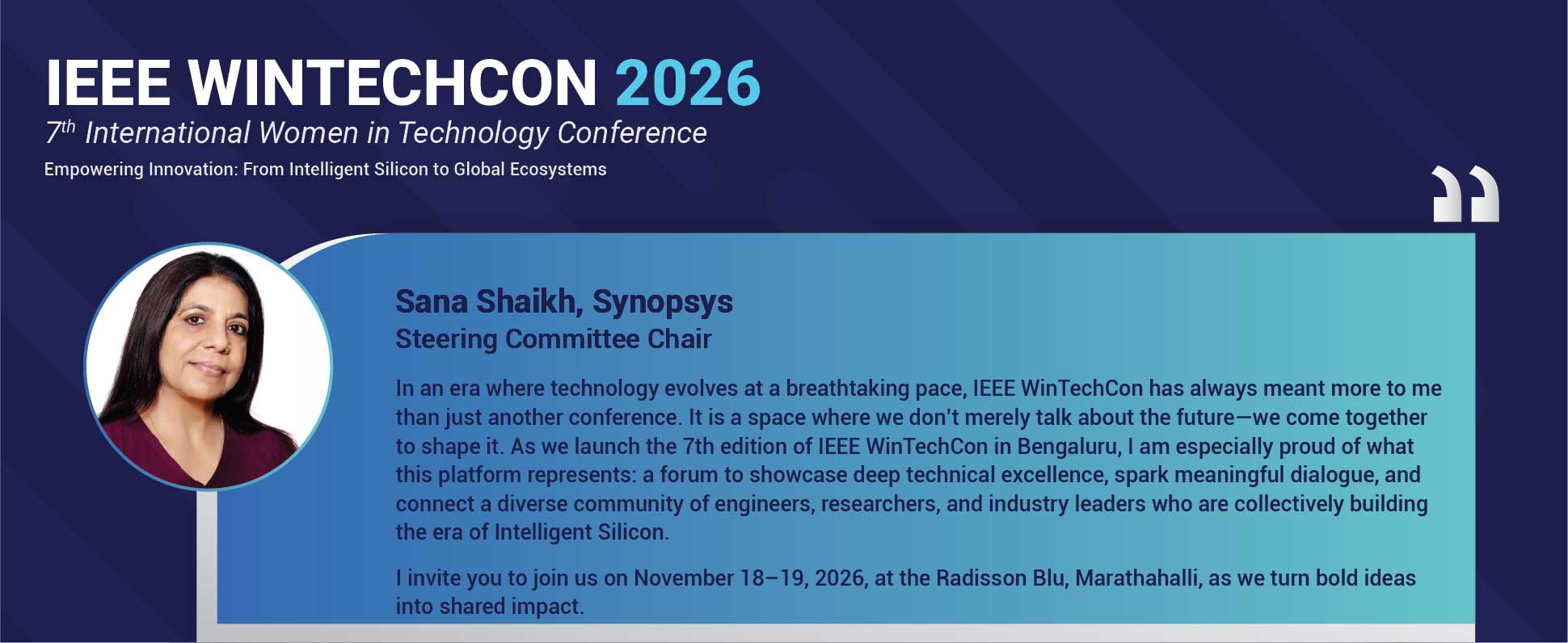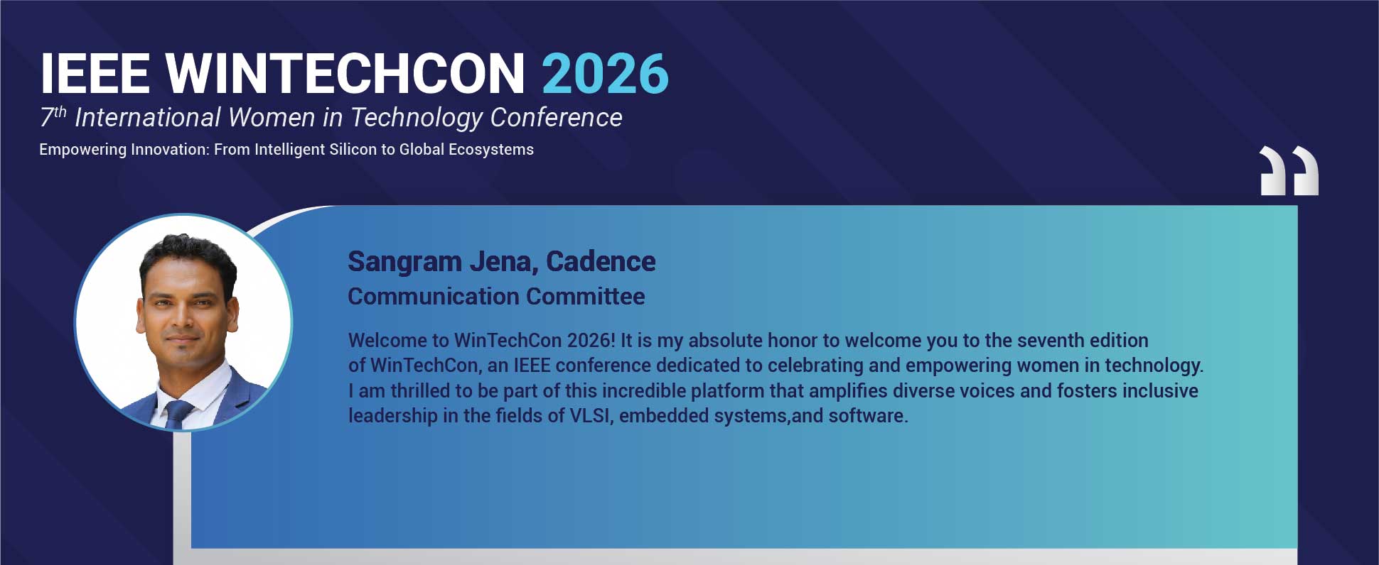 WinTechCon 2026 will be the seventh edition of the conference. It is organized in partnership with IEEE CAS (Circuits & Systems Society) Bangalore Chapter, IEEE Bangalore Section and IEEE WIE (Women in Engineering) Council Bangalore. The theme for this year conference is “Empowering Innovation : From Intelligent Silicon to Global Systems”. Get ready to experience another great year of WINTECHCON and we look forward to seeing you at the conference.